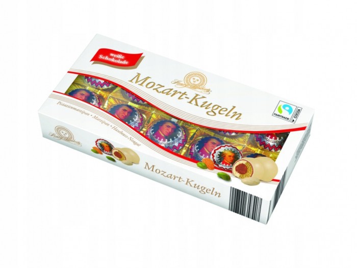 Klasyk w nowej odsłonie – wyśmienite praliny Mozart w białej czekoladzie. Bogaty skład produktu: marcepan pistacjowy, marcepan i nugat orzechowy, a to wszystko pokryte warstwami mlecznej i białej czekolady. Produkt posiada certyfikat Fairtrade.